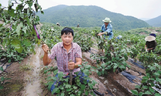 8月10日,诸暨市街亭镇董村村民张祖信在蔬菜基地整理高山茄子,力争将损失降到最低。