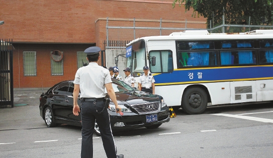 8月10日,日本政府召回日本驻韩国大使。图为在首尔的日使馆门口,大使武藤正敏的车驶离使馆。 新华社发