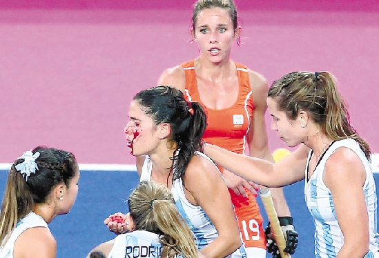 8月10日,在伦敦奥运会女子曲棍球决赛中,荷兰队以2比0战胜阿根廷队,夺得冠军。荷兰队选手霍格在传球时不慎将阿根廷队选手斯卡罗内脸部击伤,血染赛场。 新华社发