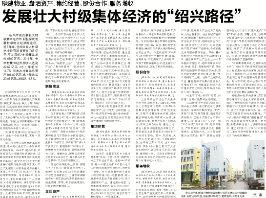 站在巩固党在农村执政基础的高度,绍兴对此进行了一系列卓有成效的探索。2009年,绍兴市委、市政府在充分把握农村发展阶段、区域发展实际和村级集体经济发展趋势的基础上,制定出台了《关于创新发展村级集体经济的若干意见》,作出了发展壮大村级物业经济的重大决策。各县(市、区)也进行了积极的探索和实践。早在2006年,绍兴县平水、王坛和稽东等3个山区镇的24个经济薄弱村,联合在平水镇开发建设了总建筑面积达4.9万平方米的绍兴市首个村级异地物业园区。上虞市从2008年开始,就探索发展村级物业经济,截至2011年底,该市共建成村级物业经营项目139个。今年该市的党代会和人代会报告提出,5年内将投入4.7亿元建设村级物业经营项目,使全市所有行政村集体年可支配(常年经营性)收入达到20万元以上,作为本届党委、政府的任期目标。