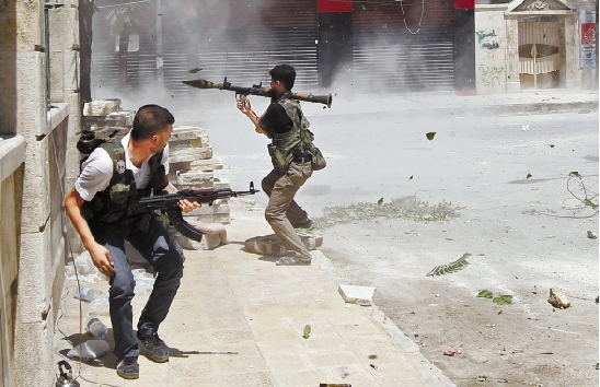 8月11日,在叙利亚阿勒颇萨拉赫丁区,一名“叙利亚自由军”武装人员向政府军发射火箭推进式榴弹。 新华社发