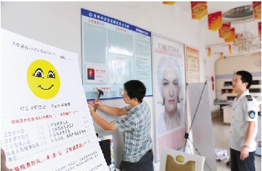 近日,东阳市卫生监督部门开始对城区宾馆、游泳场、美容美发店等公共场所实行“星级管理”,用“笑脸、平脸、苦脸”标志代替以往的好中差,让消费者一看就知道商家的卫生状况好不好。 东阳日报记者 包康轩 摄