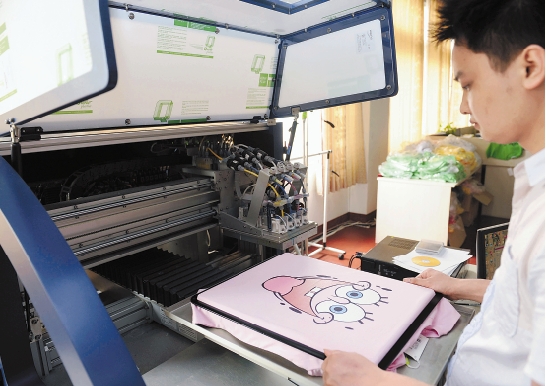 绍兴柯桥一家印染企业成功转向小批量、个性化生产之后,实现了内外贸新突破。图为该企业工作人员在打印个性T恤衫。 本报记者 梁臻 摄