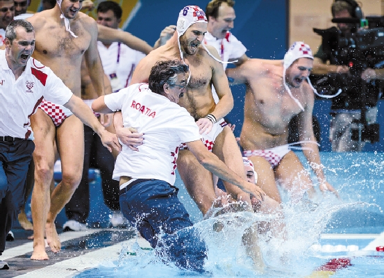 8月12日,在男子水球决赛中,克罗地亚队以8比6战胜意大利队,获得金牌。图为该队主教练鲁迪科(中,戴眼镜者)在获胜后被庆贺的队员抱入水中。