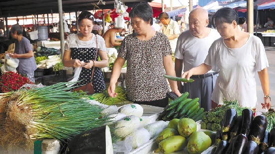 8月13日,宁波市民在菜市场选购直销蔬菜。针对连日来菜价上涨的情况,宁波市出台蔬菜价格上限措施,从8月11日至20日,全市设立25个蔬菜直销点。