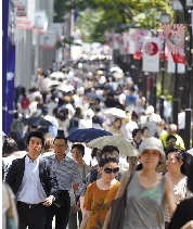 8月13日,行人走在日本东京街头。当日,日本内阁府公布的速报数据显示,日本第二季度实际国内生产总值环比增长0.3%,折算年率增长1.4%,连续4个季度增长,但与今年第一季度5.5%的年率增幅相比减速明显。