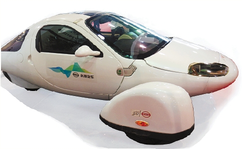 永源汽车在新能源车展上推出的新概念电动汽车以低碳环保复合材料制造,取名“无翼而飞”。据介绍,此材料比高强度钢还要硬3倍。 顾梦瑶 摄