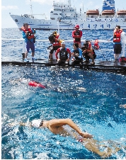 8月14日,韩国歌手金章勋率领的游泳队队员在进行游泳接力。8月13日,韩国歌手金章勋带领一支由40名大学生和其他队员组成的游泳队,启动了一项由韩国东部港口到与日本存在主权争议的独岛(日本称竹岛)的游泳接力。他们预计于8月15日光复节下午登上独岛。 新华社发