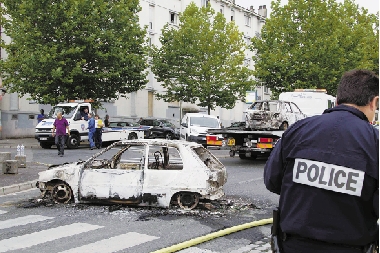 8月14日,在法国北部城市亚眠,警察在清理骚乱过后的街道。 新华社发