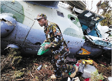 8月13日,在肯尼亚山,一名乌干达空军工作人员从坠毁的乌干达军用米-24型武装直升机旁走过。肯尼亚官员14日确认,在肯尼亚坠毁的两架乌干达军用直升机中,已有8人获救、2人遇难,另有4人下落不明。 新华社发