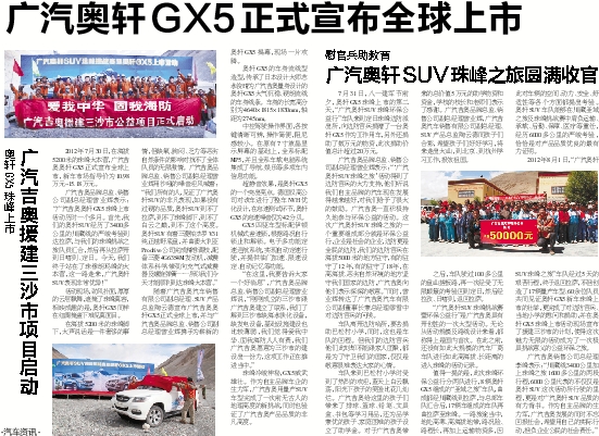 2012年8月1日,“广汽奥轩SUV珠峰之旅”车队经过5天的艰苦行程,终于返回拉萨,不但创造了17辆量产车型、60余位队员共同见证奥轩GX5新车珠峰上市的壮举,更完成了对边防官兵、当地小学的慰问和捐助,并在奥轩GX5珠峰上市活动现场宣布了援建三沙市的计划,使得这次魅力无限的活动成为了一次极具挑战意义的公益环保之旅。