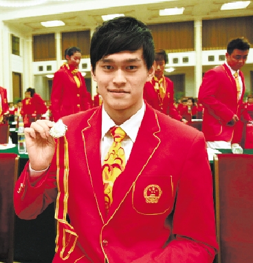 图为8月17日,孙杨在伦敦奥运会中国体育代表团总结表彰大会上展示体育运动荣誉奖章。 新华社发