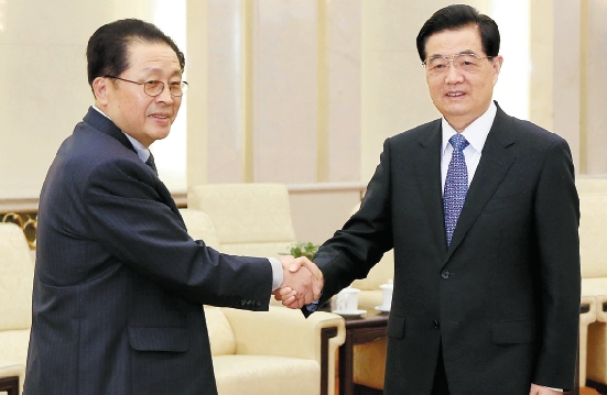 | 8月17日,中共中央总书记、国家主席胡锦涛在北京人民大会堂会见由朝鲜劳动党中央政治局委员、行政部部长、国防委员会副委员长张成泽率领的中朝两个经济区开发合作联合指导委员会朝方代表团。 新华社记者 马占成 摄 |