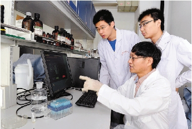 8月16日,张学记教授(坐者)和学生一起研究工作。 新华社记者 何俊昌 摄