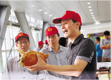 8月18日,绍兴网、绍兴文明网和陕西渭南新闻网等联合发起义卖活动,资助渭南市的大学贫困新生。图为一名志愿者在叫卖珍稀白玉龟。 记者 金敖生 摄