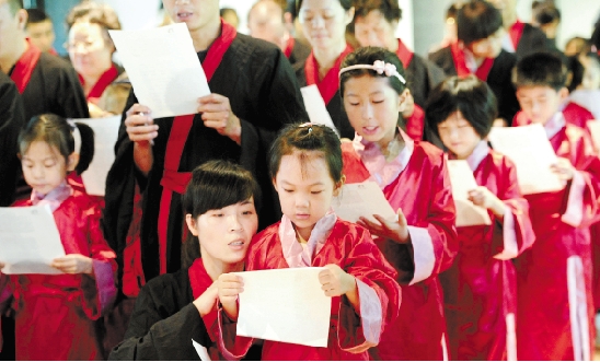 8月19日,杭州万松书院举行暑期“入泮”仪式,40多位小学童和家长穿上汉服参加了古代入学典礼。图为在孔子像前,小学童与家长在一起朗诵《弟子规》。