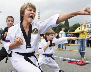 8月18日,“武道会展”武术节在莫斯科全俄展览中心举行。参与者在此次武术节上向观众展示了传统功夫、柔道、跆拳道、空手道等项目。图为各路高手展示看家本领。 新华社发