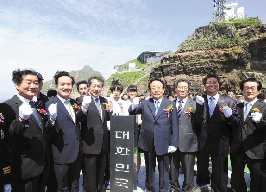 8月19日,在与日本存在主权争议的独岛(日本称竹岛)上,韩国行政安全部长官孟亨奎(前排左三)等政府人员参加标志石的揭幕仪式。 新华社发
