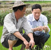 廖必长(右一)在指导水稻新技术高产示范方工作。