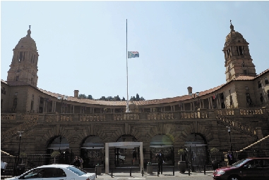 8月20日,南非行政首都比勒陀利亚总统府降半旗,悼念在西北省铂矿冲突中遇难的44人。南非当日起对在全国暴力事件中死亡的南非人、尤其是西北省铂矿遇难者进行为期一周的全国哀悼。 新华社记者 李启华 摄