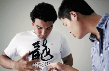 哈立德(左)向师傅展示刚买的文化衫,说自己也属龙。