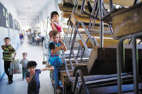 8月23日,在叙利亚首都大马士革的一所难民安置学校,孩子们在走廊上玩耍。 新华社记者 覃海石 摄
