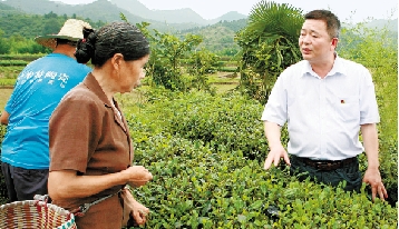 郑初一(右一)向茶农了解茶叶生产情况。 丰智慧 摄
