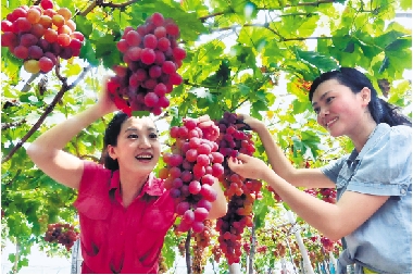 8月26日,遂昌北界镇的红提观光园里,游客饶有兴致地采摘。 县委报道组 潘俊 摄