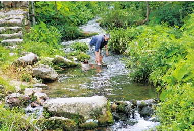 村民徐振富打理山林归来,在小河里洗脚。程圆霏 摄