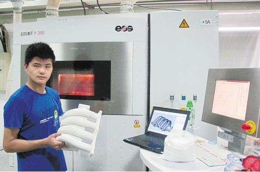 由德国eos公司生产的3D打印机将电脑上的3D数据模型变成实物。