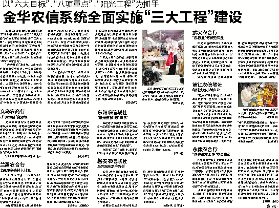 近日,金华农信系统全面启动了“金融服务进村入社区”、“阳光信贷”和“富民惠农金融创新”“三大工程”。省农信联社金华办事处主任祝晓平表示,为确保将“三大工程”打造成民心工程、惠民工程、品牌工程,要以“六大目标”、“八项重点”、“阳光工程”工作为抓手,全力助推“两富”金华建设。