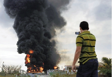 8月25日,在委内瑞拉西部法尔孔州的蓬托菲霍,一名男子在拍摄发生爆炸的阿穆艾炼油厂。根据委内瑞拉官方公布的最新数据,当天凌晨发生的阿穆艾炼油厂爆炸已造成39人死亡。 新华社发