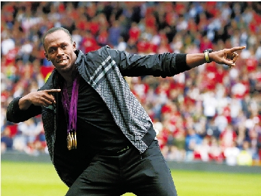 | 8月25日,牙买加田径运动员博尔特在老特拉福德球场做出他标志性的庆祝动作。当日,在英格兰足球超级联赛第二轮比赛中,曼彻斯特联队主场以3比2险胜富勒姆队,新援范佩西和香川真司均贡献了进球。 新华社发 |