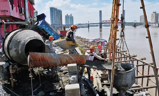 8月26日,在平阳县鳌江强塘加固工程工地上,施工人员顶着烈日浇筑基桩。该县对8公里长的鳌江大堤进行加固,以解决大堤沉降、水毁等问题。 本报记者 吴元峰 吴国方 通讯员 林炮 摄