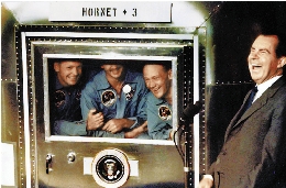 这是1969年7月24日,美国阿波罗11号宇航员尼尔·阿姆斯特朗(左)、迈克尔·柯林斯(中)和巴兹·奥尔德林与时任总统的尼克松在美国大黄蜂号航空母舰上的资料照片。 新华社发