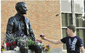 8月25日,在美国印第安纳州普渡大学以尼尔·阿姆斯特朗的名字命名的工程学院前,一名学生向阿姆斯特朗雕像献花。 新华社发