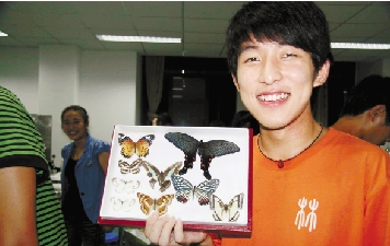学生展示他们亲手制作的蝴蝶标本。 陈胜伟 摄