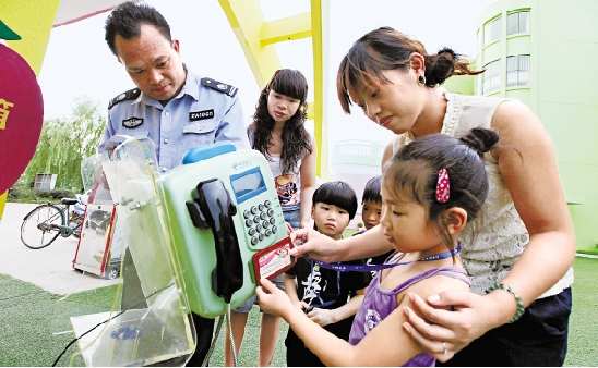 8月27日,台州椒江区星辉国际幼儿园门口,老师正指导学生在“家校通”机上用安全智能接送卡练习刷卡。开学之际,台州市各小学普遍更新升级了安全装置。