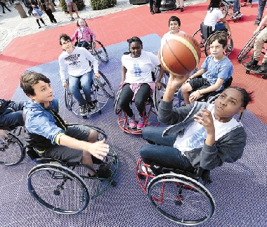 8月26日,孩子们在轮椅篮球体验活动中。当日,在伦敦的圣保罗大教堂前,残奥会组委会组织轮椅篮球的体验活动,让健全儿童感受轮椅篮球运动,为残奥会做宣传。 新华社发