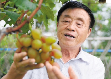 8月23日,常德盛在村无公害葡萄园内察看葡萄长势。 新华社发