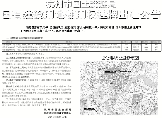 五、本次挂牌出让详细资料请参阅挂牌出让文件。有关挂牌出让文件资料可于2012年9月5日起到杭州市公共资源交易中心(杭州市钱江新城新业路311号市民中心L楼3楼)7号土地交易窗口索取。