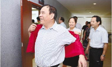 吕祖善讲解前穿上志愿者红马甲。 记者 魏志阳 摄