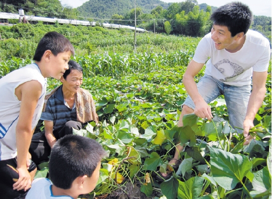 金利宾(右一)和李明熙一家在“爱心农场”。 吕玥 摄
