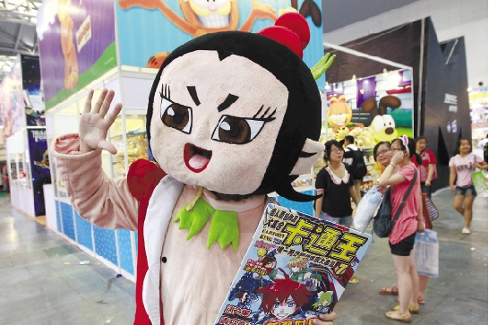 2012年7月12日,“葫芦娃”在博览会上推销国产动漫产品。当日开幕的2012中国国际动漫游戏博览会吸引了来自13个国家和地区的308家动漫游戏知名企业。 新华社记者 裴鑫 摄