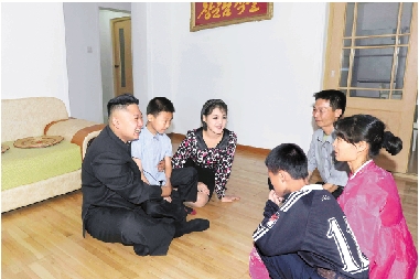 这张朝中社9月5日提供的照片显示,朝鲜最高领导人、朝鲜人民军最高司令官金正恩(左一)携夫人李雪珠(左三)访问新入住仓田街新居的居民家庭。 新华社发