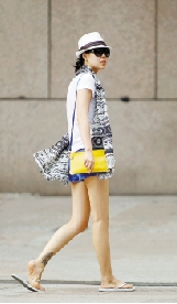 走动间随着飞舞的白底黑格围巾最能抓人眼球,无时无刻显示着淡雅和飘逸;搭上衬衫、短裤、拖鞋,这样典型的休闲装扮,更有舒适、悠然的味道;不是随意的不修边幅,而是享受生活的闲适服装。