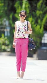 粉红是跳跃的颜色,粉红的裤装更是跳脱的张扬;上身无袖衫单薄的白底显然有些跟不上节奏,但花枝与花的组合拉了它一把,淡粉和浅黄的花瓣攒动,构成的图形新颖独特,让活泼、张扬的青春气息弥漫开来。