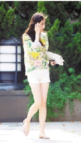 白、黄、绿三色构成的花朵绽放场面印上服装多而不杂,远远看着反而有着一种清雅的感觉,下身的白色短裤,也加重了清爽的味道。长发飘扬间,整个人散发着如莲花般的清丽,让人看到了柔美,感受到了清新。