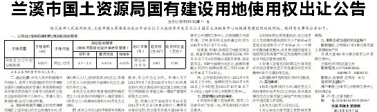 经兰溪市人民政府批准,兰溪市国土资源局决定公开出让位于兰溪经济开发区兰江片园区生活服务中心地块国有建设用地使用权。现将有关事项公告如下: