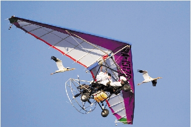 9月5日,在俄罗斯亚马尔-涅涅茨自治区,俄总统普京驾驶动力滑翔机从两只白鹤旁飞过。 新华社发